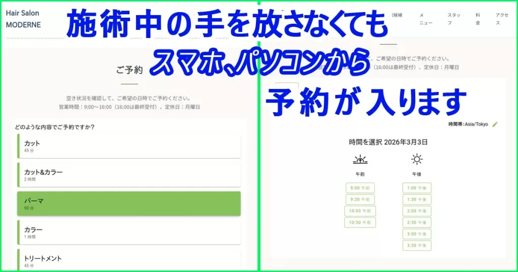スマホやパソコンから、自分で空き具合を見て、そこに予約を入れる……お店の人の手もわずらわせません。