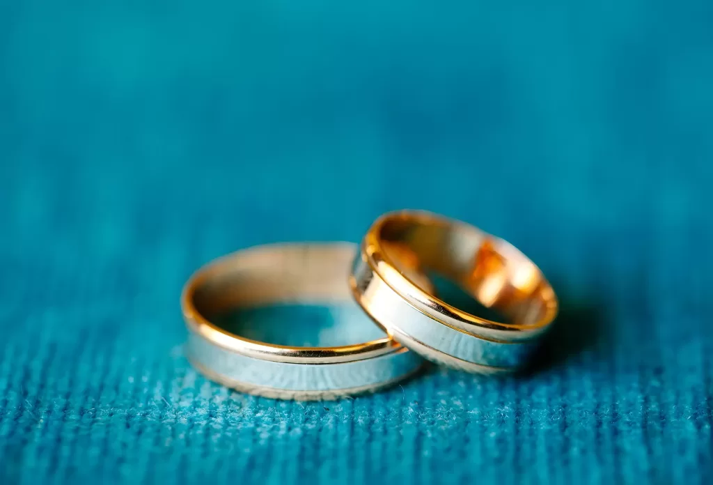 ゴールドとシルバーのツートーンが美しい、モダンで洗練されたウェディングバンドです。