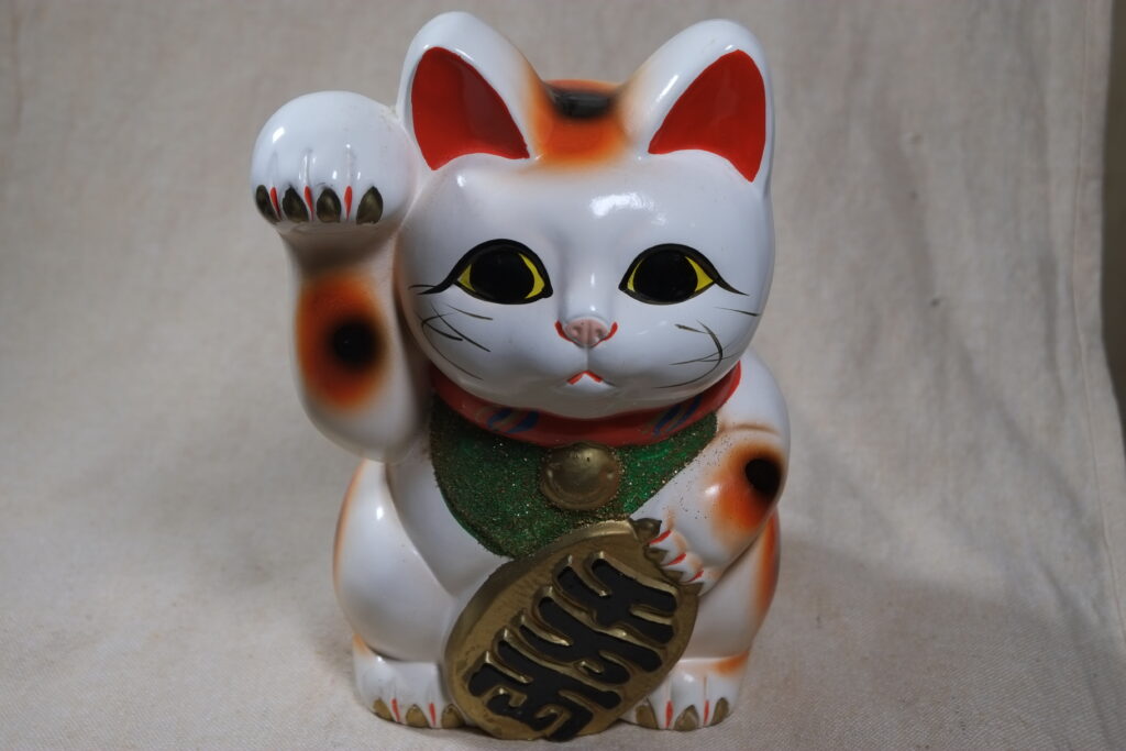 白地にオレンジと黒の斑が特徴的な三毛猫のデザインです。左手を高く上げた「招き」のポーズで、商売繁盛を願う縁起物として親しまれています。